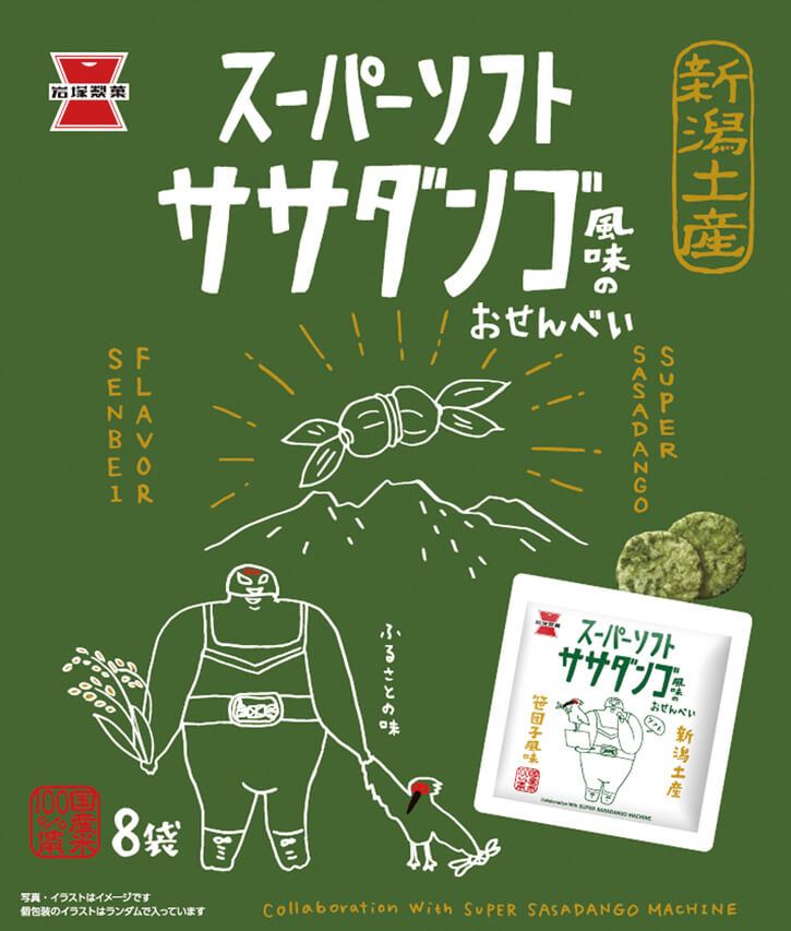 「岩塚製菓」が新潟の覆面レスラー、スーパー・ササダンゴ・マシンとコラボした新潟限定商品。ソフトな食感の生地に、笹団子風味に仕上げたパウダーをまぶしていて、ひと口食べるとヨモギの香りが口に広がる。後から小豆の風味が追いかけてきて、まるで笹団子を食べているかのようなクセになる味わいに。