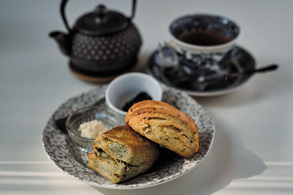 看板は、外側のサクッとしたパイ生地のような歯ざわりと、内側のしっとりとした食感にファンの多い自家製スコーン。プレーンのほか、ヨモギやクルミ、季節のフレーバーもあるので、紅茶との豊かな組み合わせを楽しんで。